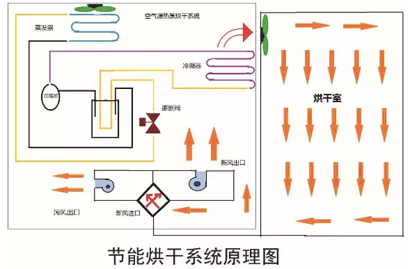 制冷剂被压缩机加热,成为高温高压气体,进入冷凝器,冷凝液化放热,成为液体,同时将烘干房空气加热,从而达到提高烘干房温度的目的。通过热风的形式使物料中的水分汽化蒸发,蒸发出来的水蒸气由排湿系统排走而达到烘干的目的。
